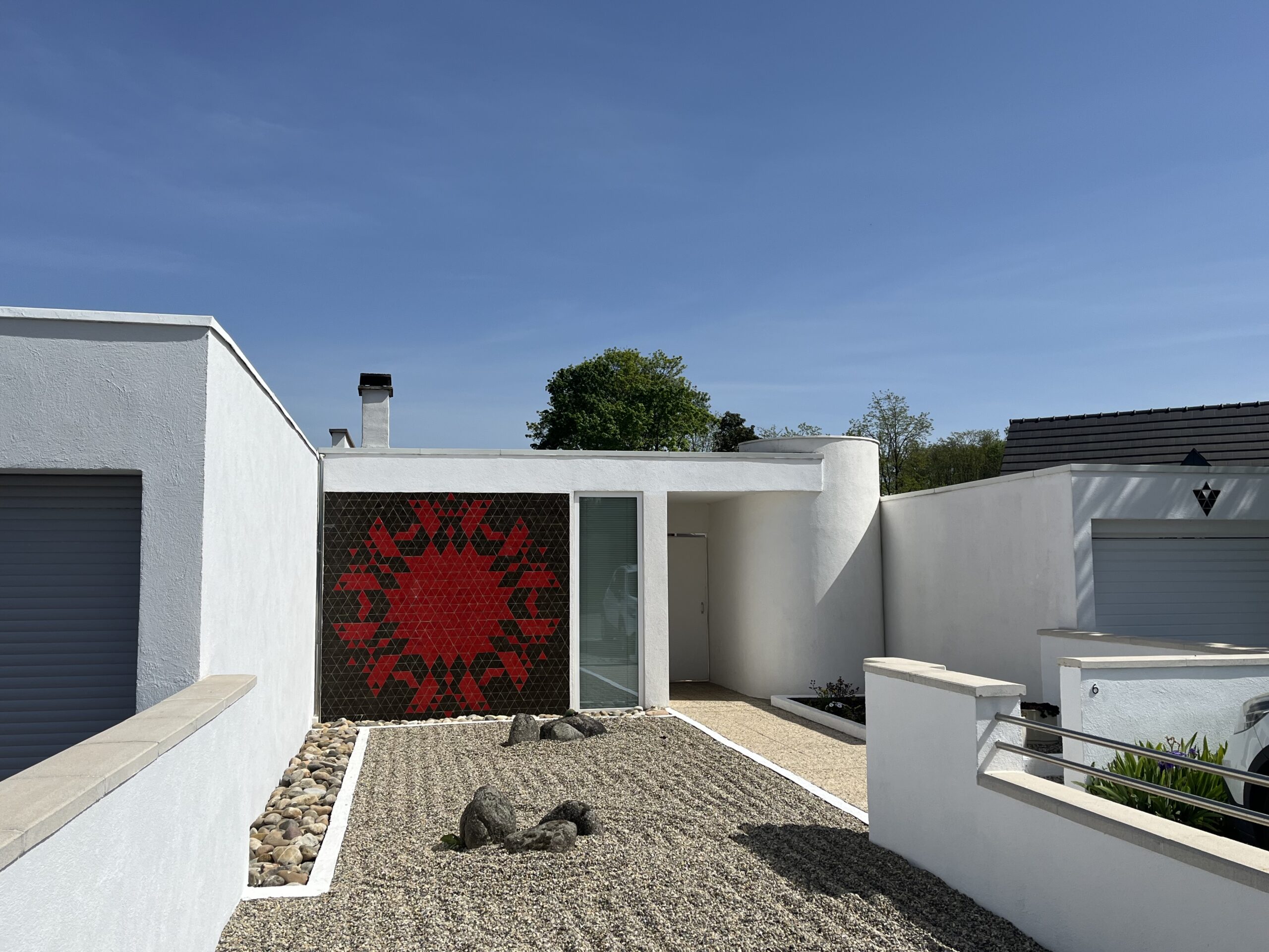 L’extérieur des maisons, marqué par sa singularité, se démarque des maisons traditionnelles alsaciennes par sa blancheur éclatante, ses toits plats et ses façades ornées de mosaïques en pâte de verre bicolore. Les vastes pelouses sans clôtures à l’avant de chaque maison offrent un cadre de vie où chaque rue semble être une véritable œuvre d’art. Les matériaux de prédilection sont le verre, le béton ainsi que l’acier.